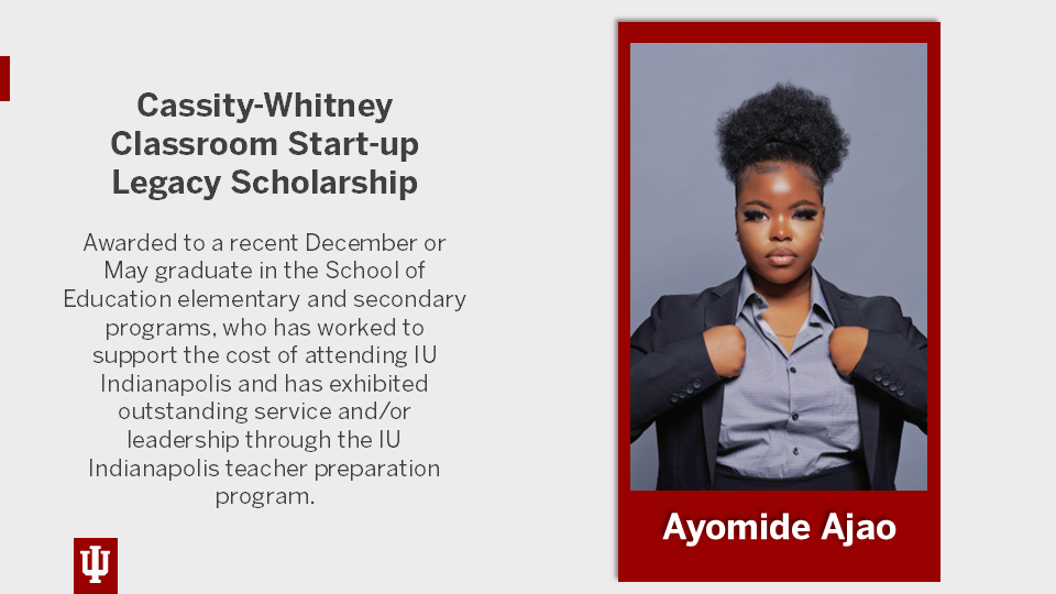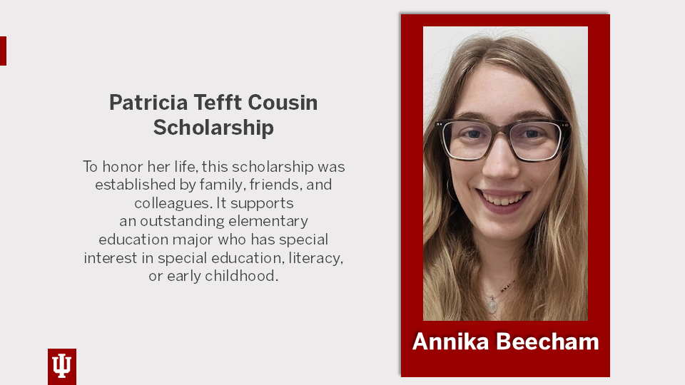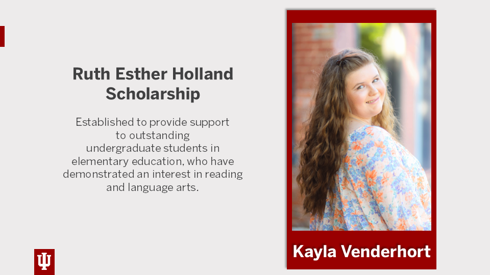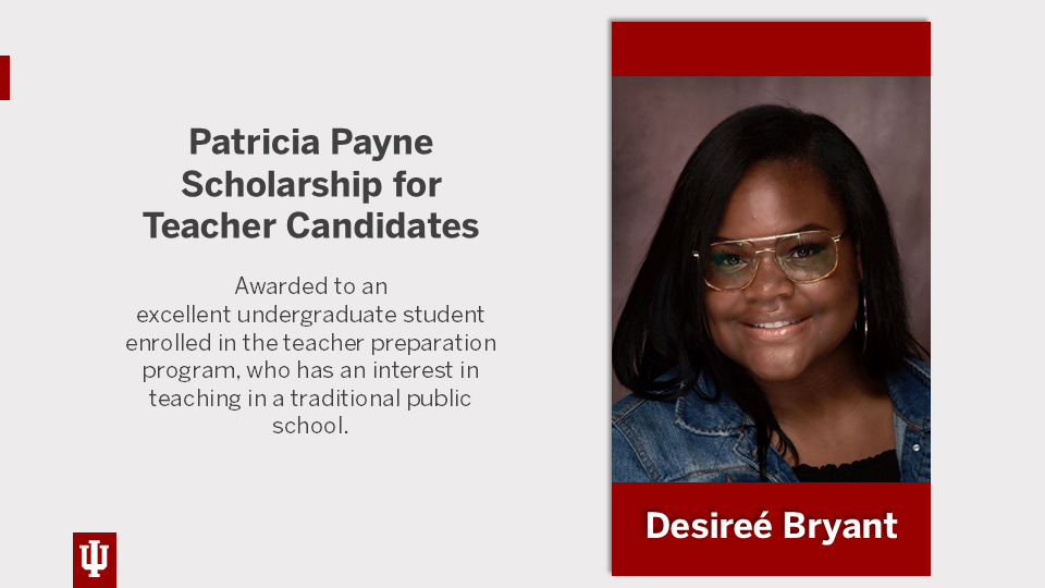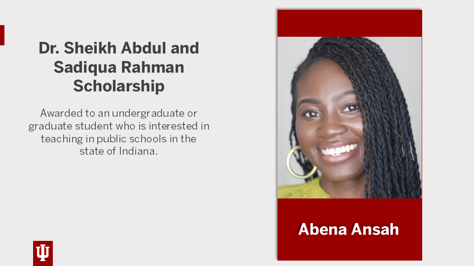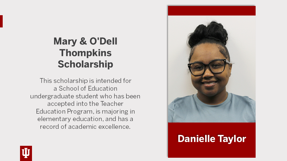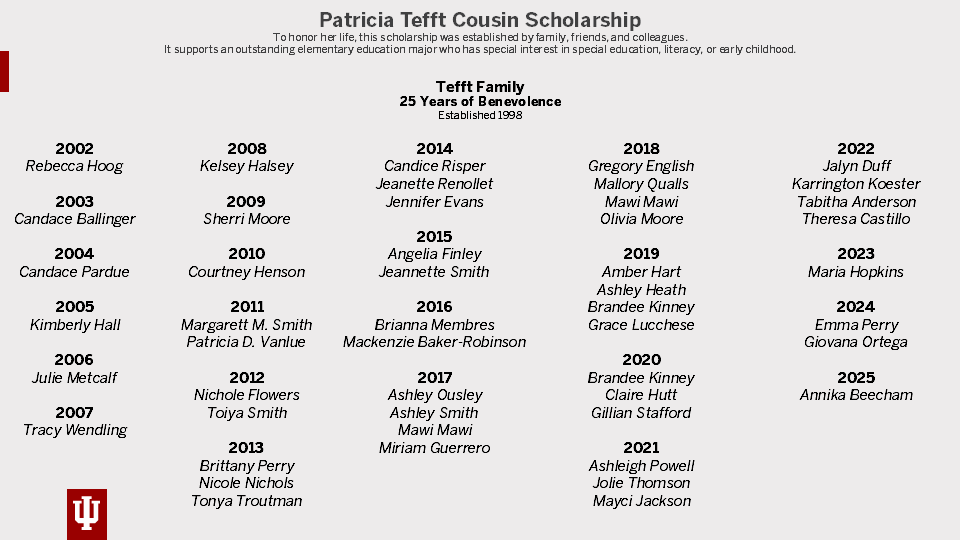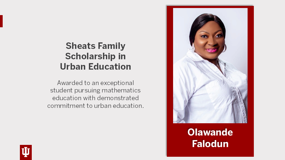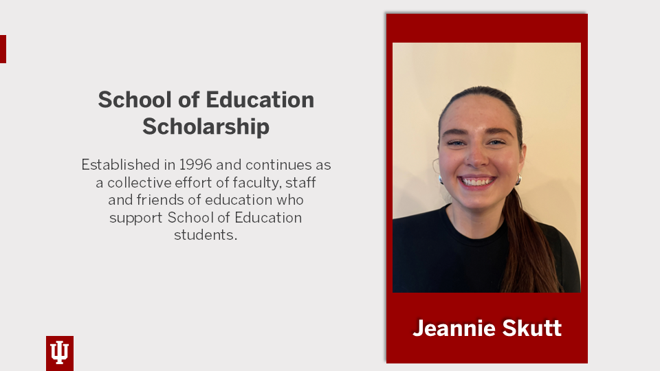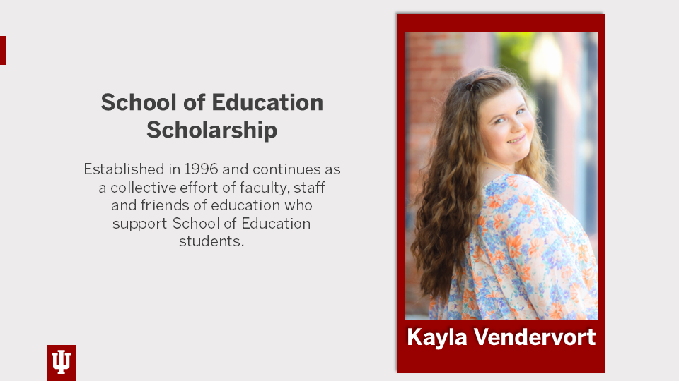 Any IU School of Education in Indianapolis student is invited to apply for one or more scholarships as long as all criteria are met. The School of Education Scholarship Committee selects recipients who are then recognized at the Honors Convocation held in the Spring. Attendance at this event is required for recipients.