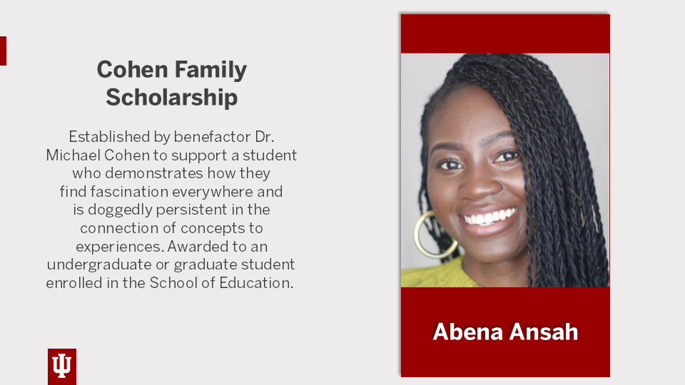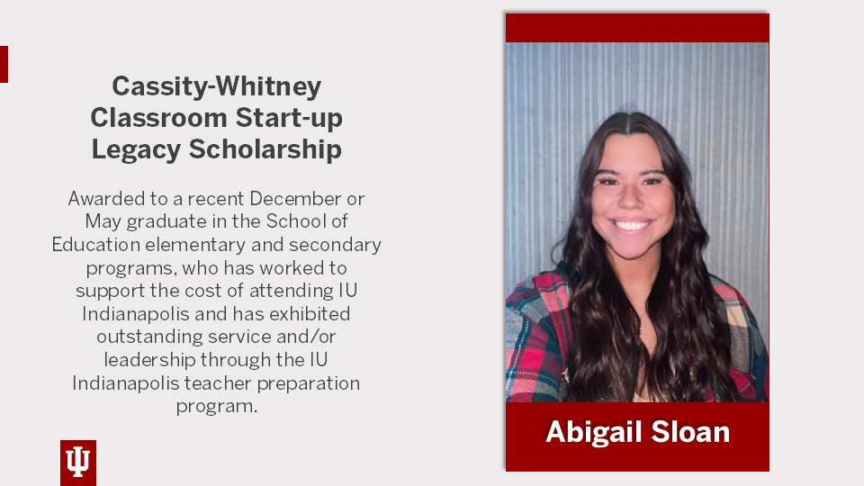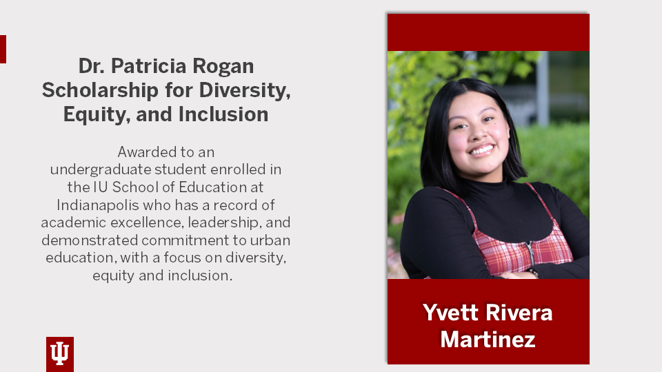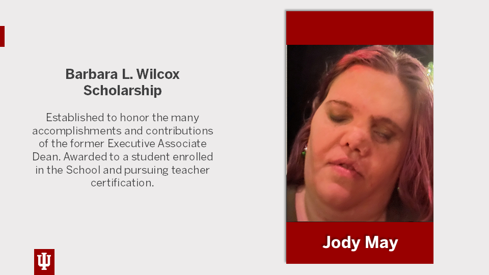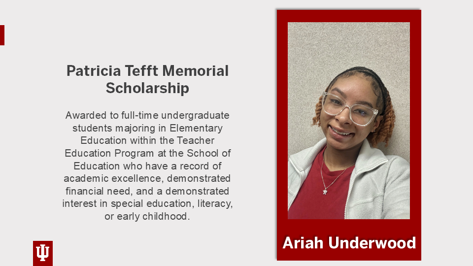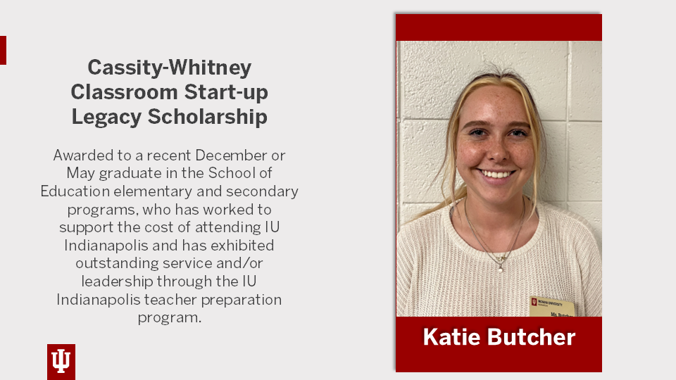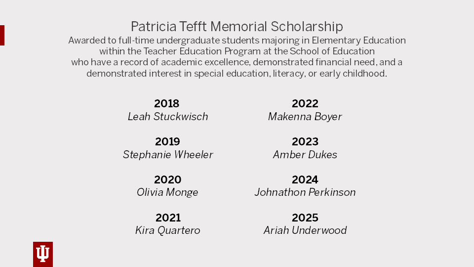 Any IU School of Education in Indianapolis student is invited to apply for one or more scholarships as long as all criteria are met. The School of Education Scholarship Committee selects recipients who are then recognized at the Honors Convocation held in the Spring. Attendance at this event is required for recipients.